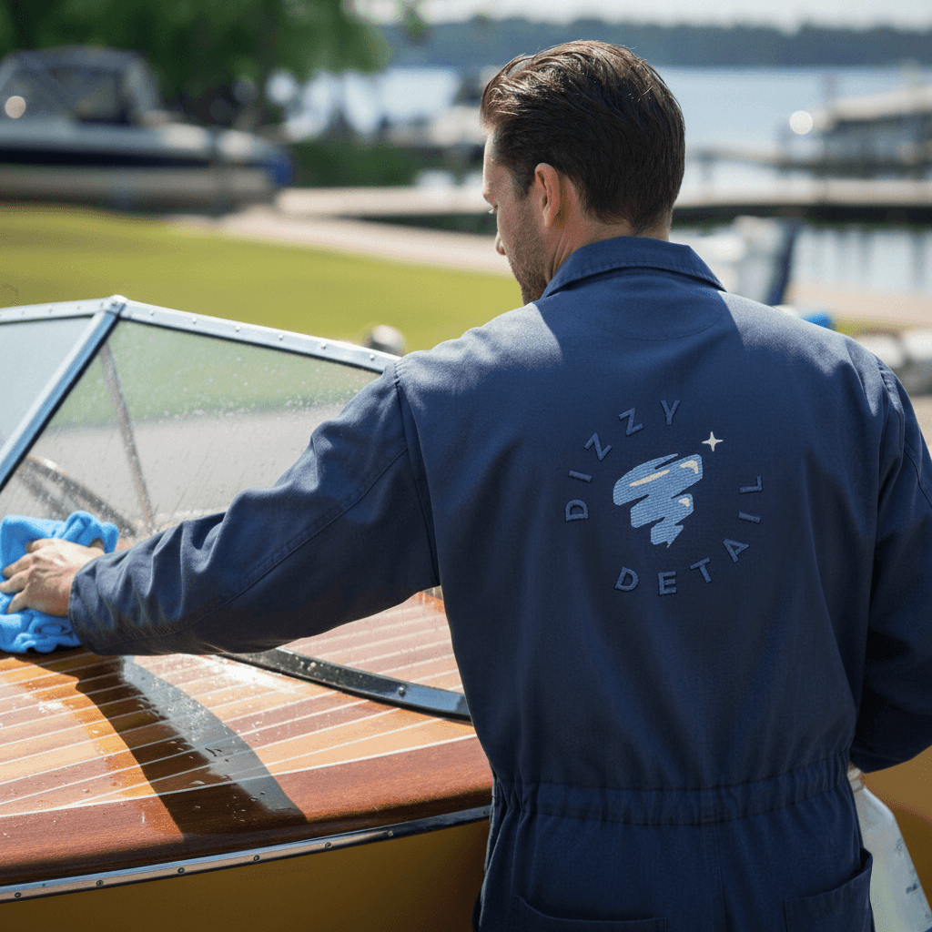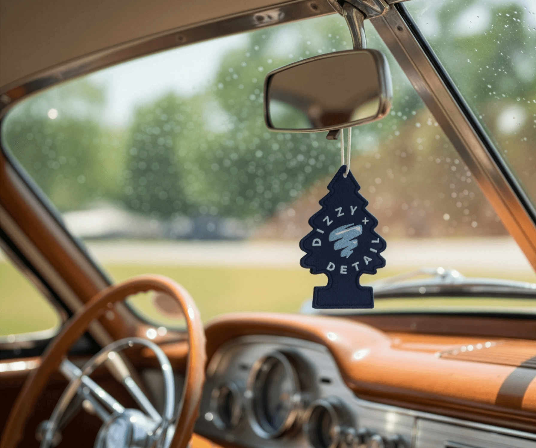 Building out the visual identity of the brand doesn't just include the logo, it but the uniforms and customer giveaways as well. Traditional workman's jumpsuits in navy blue evoke trustworthiness and vintage style of the brand. Scent trees given away after every successful Dizzy detail job not only keep the car smelling fresh long after the clean, but also builds brand loyalty and awareness.
